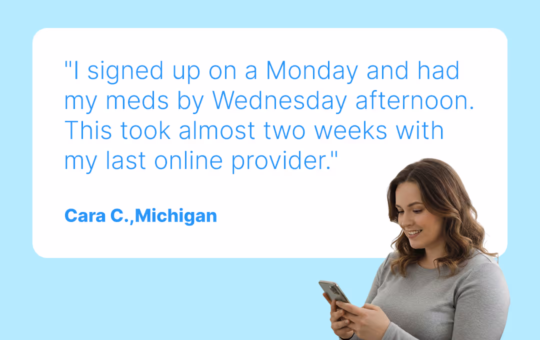 Continue ->Get started in as little as 48 hours. We ship a full 3-month supply so you’re never chasing refills or dealing with unnecessary hoops.